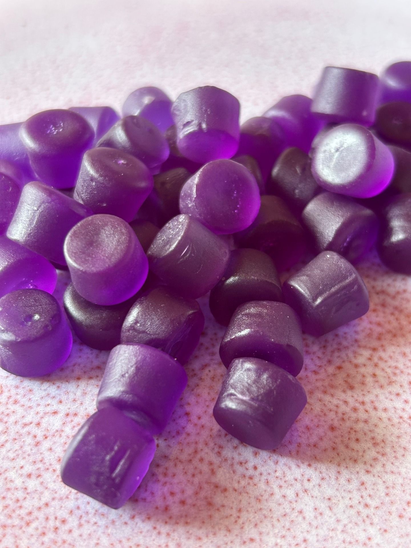 Les Sucreries Violette Mauve Frisia sont des bonbons à la violette subtils et élégants, à la texture ferme et au goût floral raffiné.