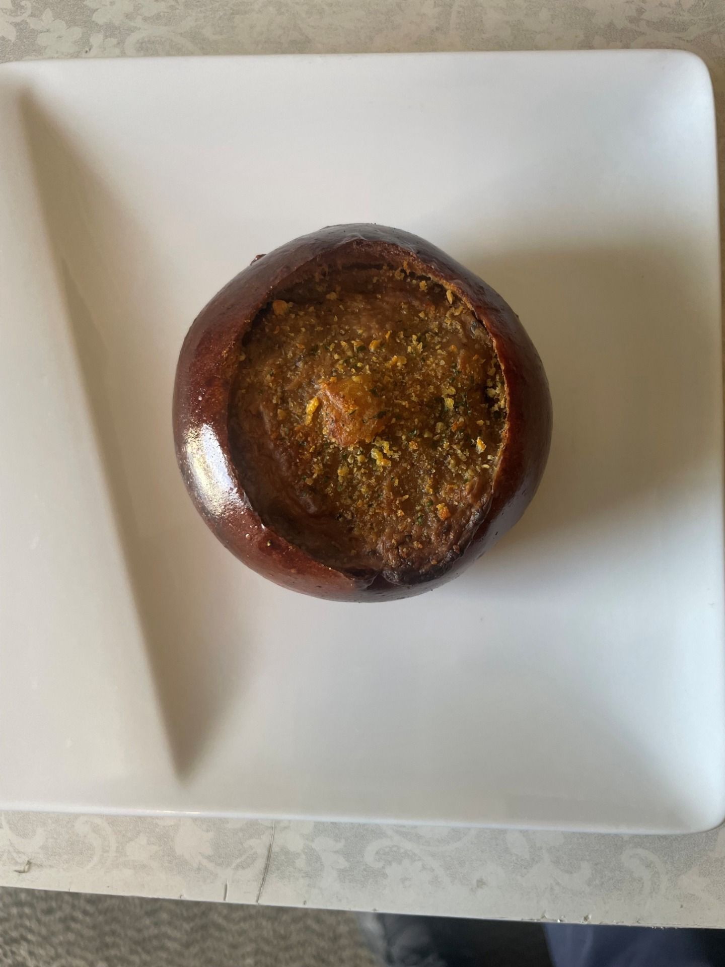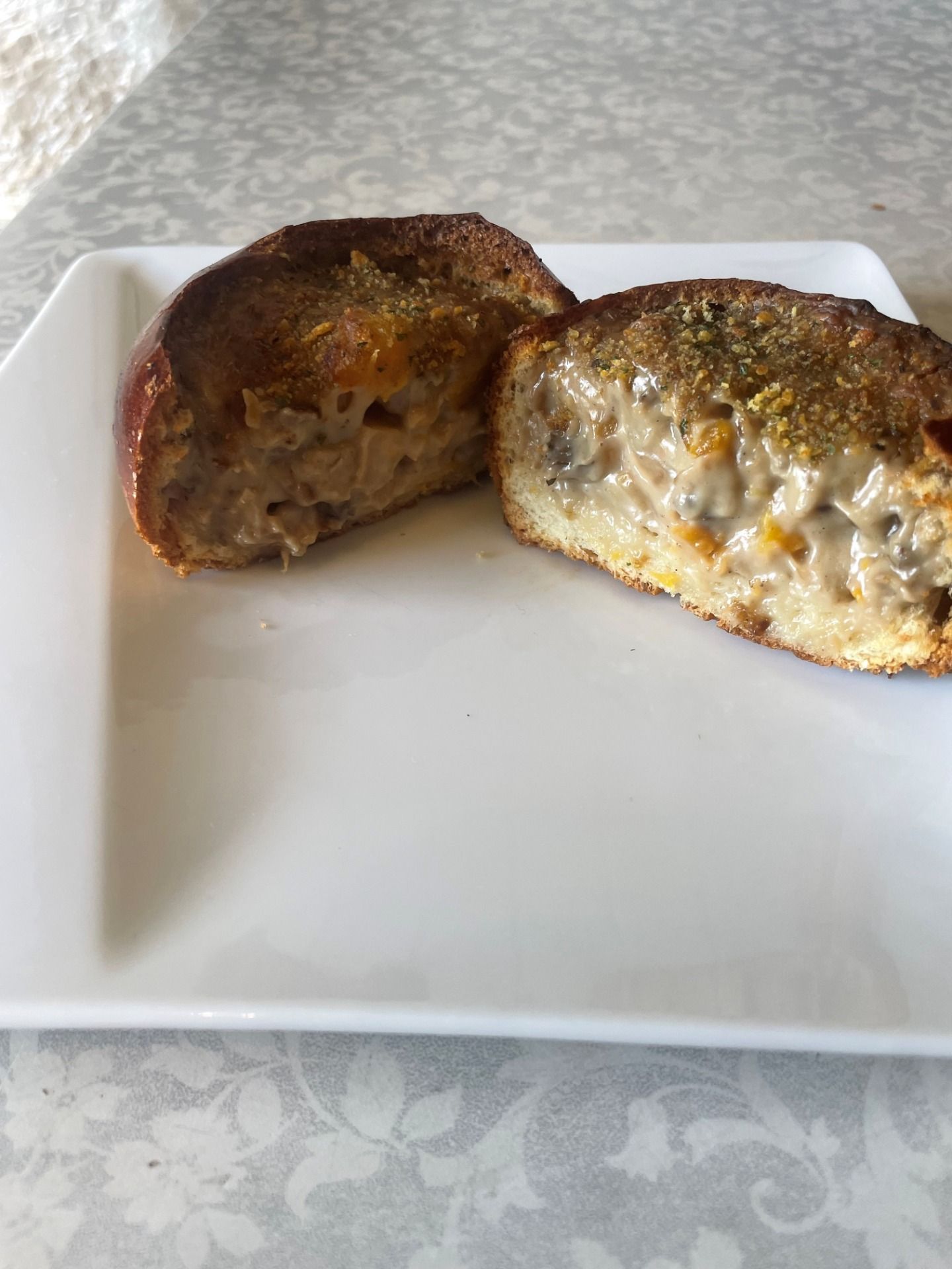 Et Toque ! Traiteur vous propose une brioche garnie de poulet, d'une sauce forestière et de butternut, le tout relevé au Porto rouge